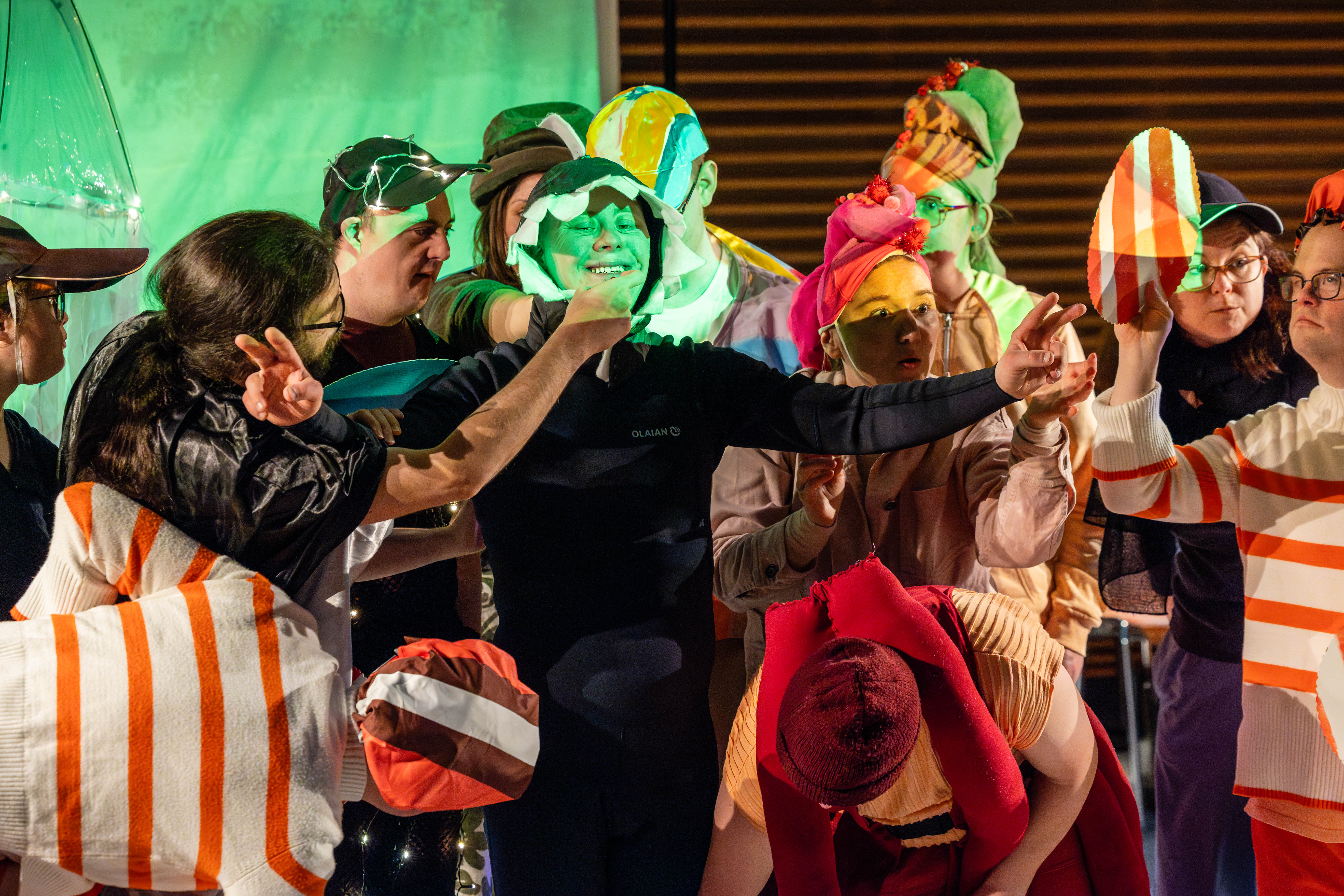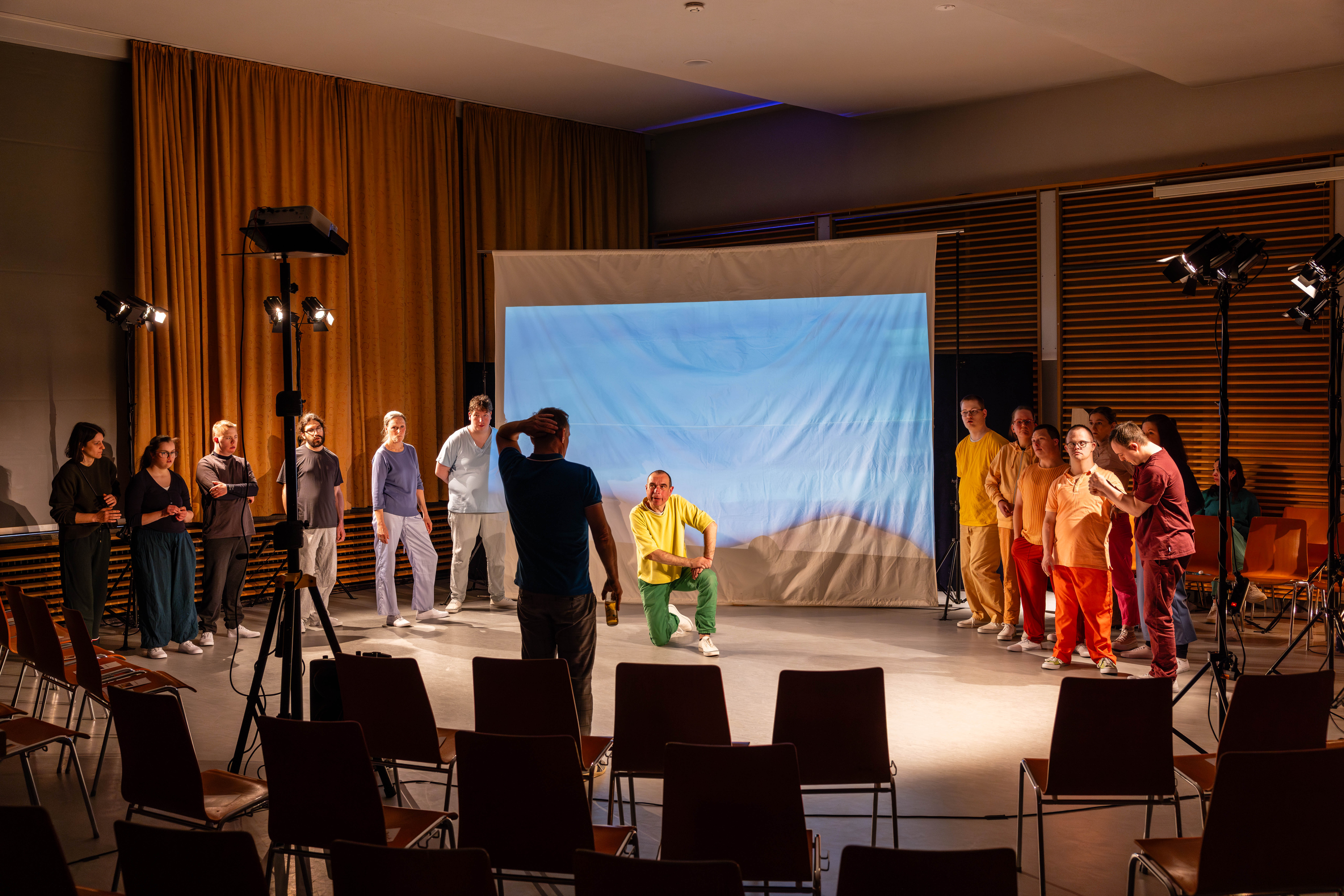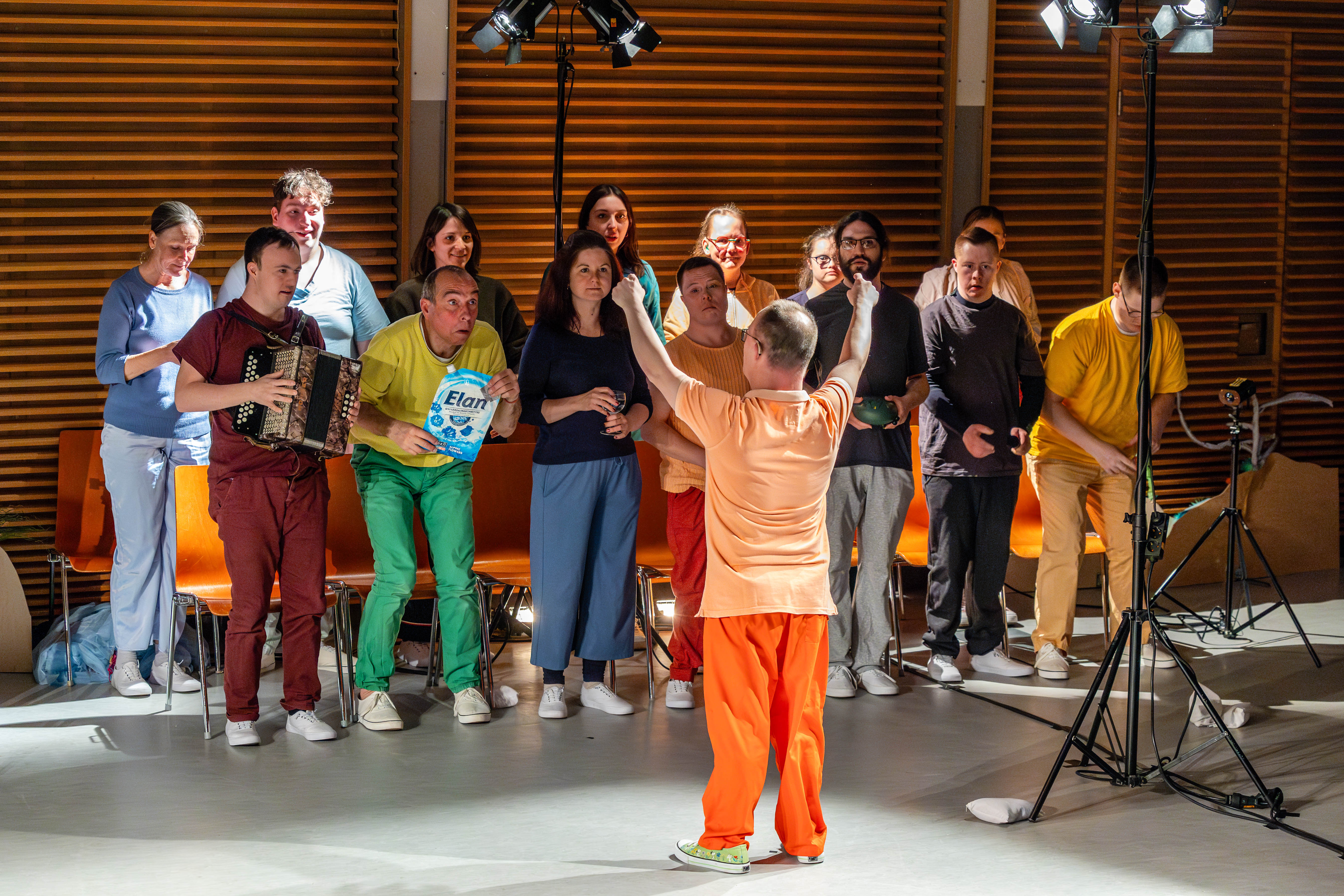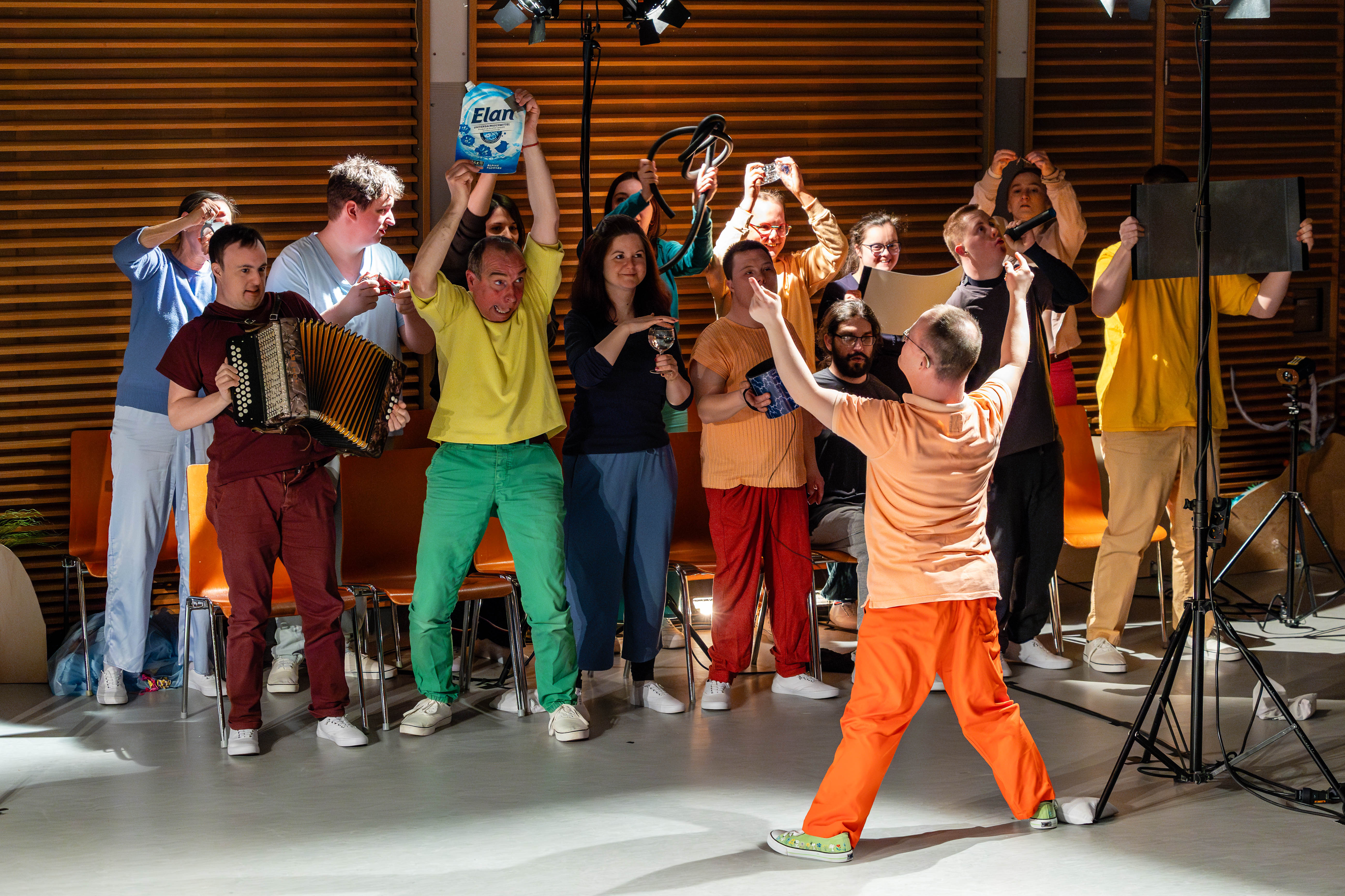 Ein Orchester tritt auf. Alle begrüßen sich, schwatzen über alles Mögliche - der Dirigent kommt. Seltsame Instrumente kommen da zum Einsatz:
